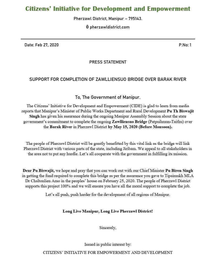 Here’s a press release of our moral support for the Government of Manipur to complete the ongoing Bailey Suspension Bridge at Zawlliensuo (over Tuiruong river) between Patpuihmun and Taithu villages.
