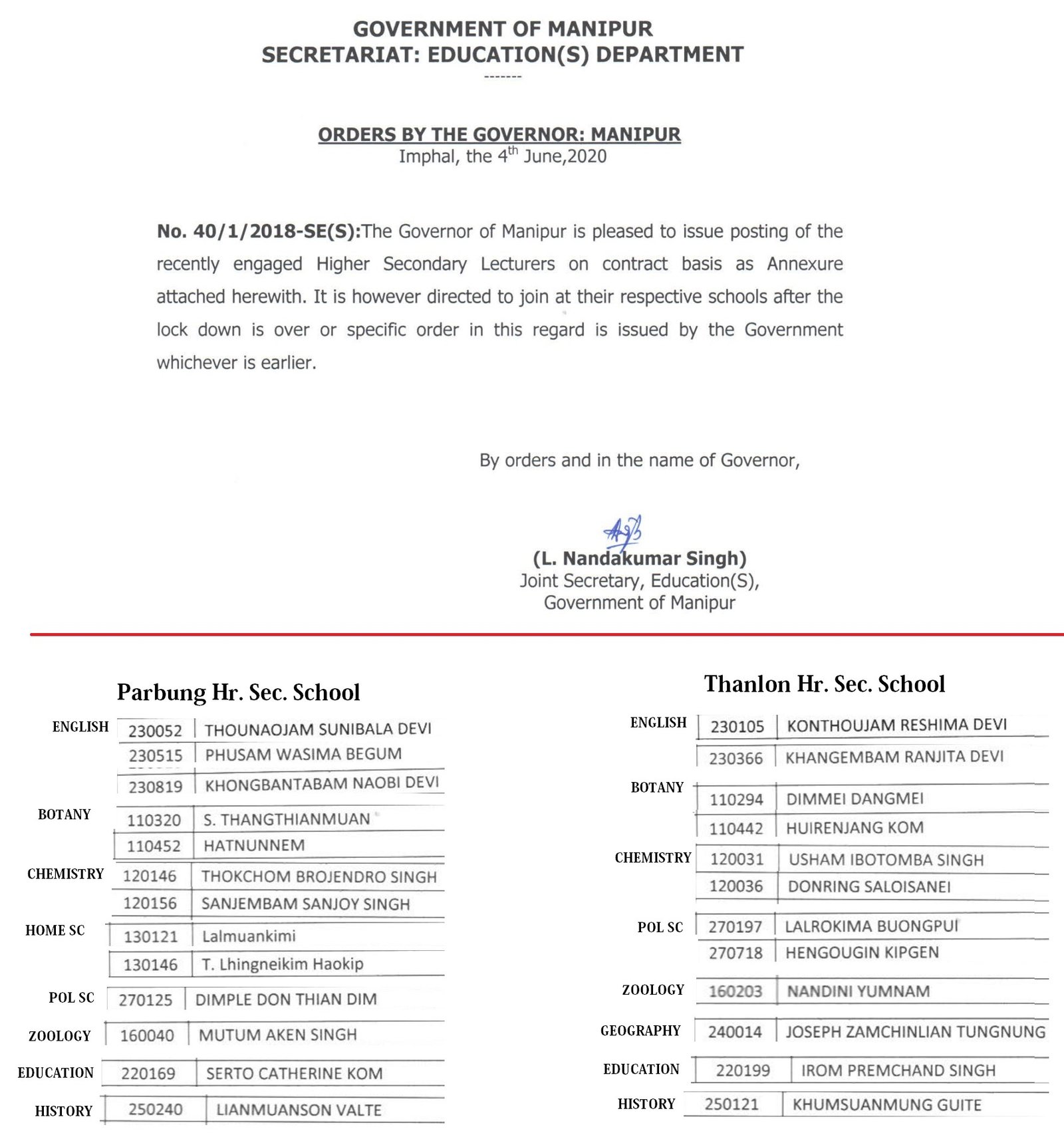Pherzawl, June 17, 2020: The Government of Manipur on June 4, 2020, issued an order assigning new lecturers for higher secondary schools across the state. As many as 25 lecturers have been assigned to Parbung Hr Sec and Thanlon Hr Sec. schools. These new recruits are additional staff to the already existing staff in both the institutions and they have been informed to go to their places of work as soon as Covid-19 shutdown restrictions are relaxed or even before the end of restrictions if there is a new direction.