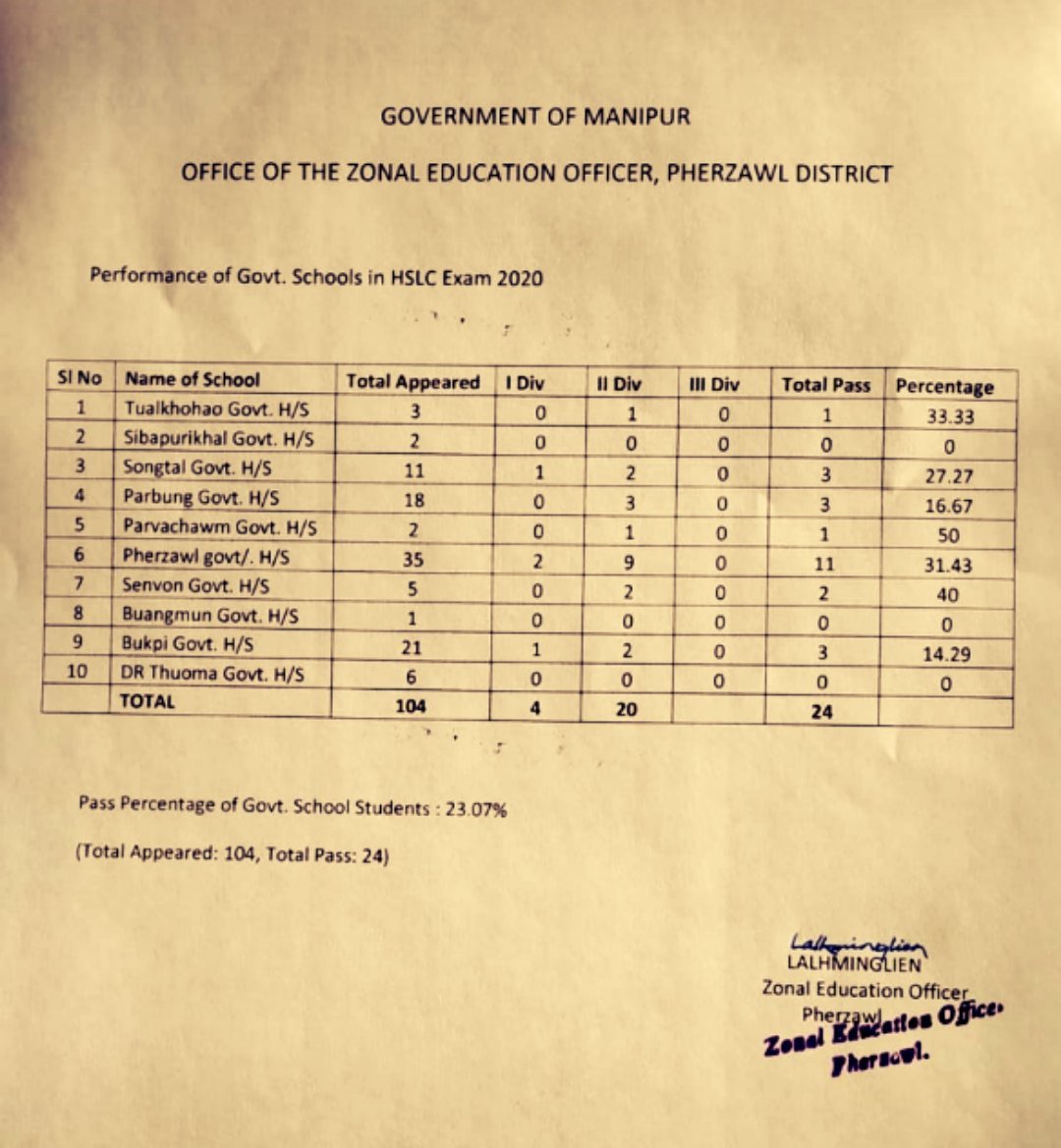 Pherzawl, June 18, 2020: Government schools in Pherzawl District registered just 23.07% pass percentage in the recently declared HSLC 2020 Exam, according to a document released by the district ZEO.