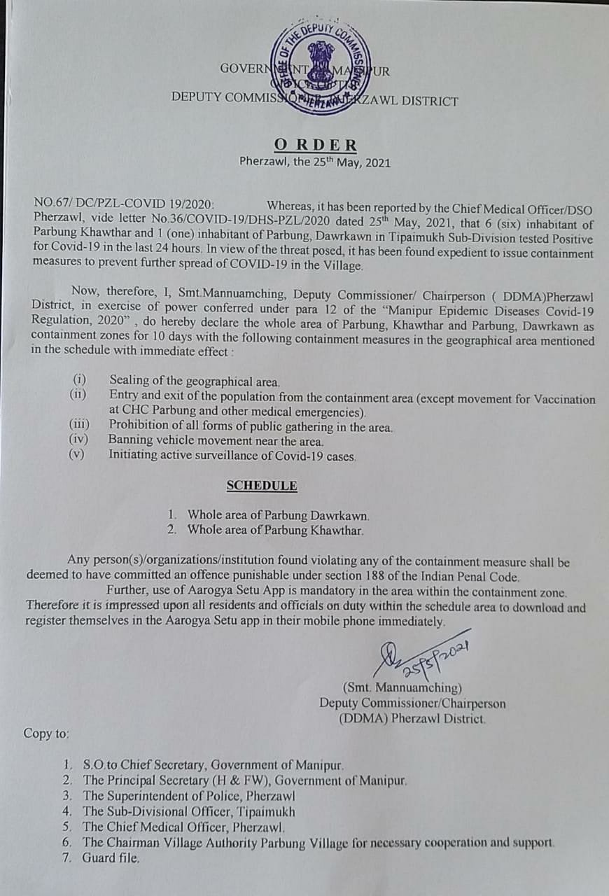 Five new cases of Covid-19 infections were detected in Pherzawl District’s Hmarkhawpui (Sipuikawn) village on August 3, 2021. The Deputy Commissioner has declared the village as a containment zone after information was received from the Chief Medical Officer. Here’s the notification.