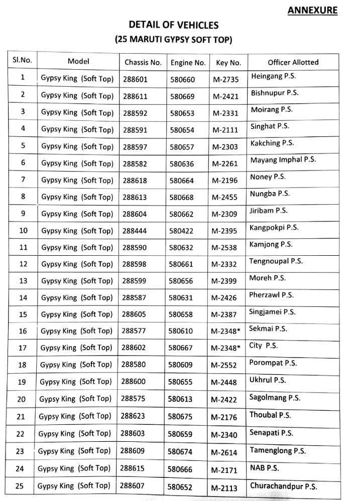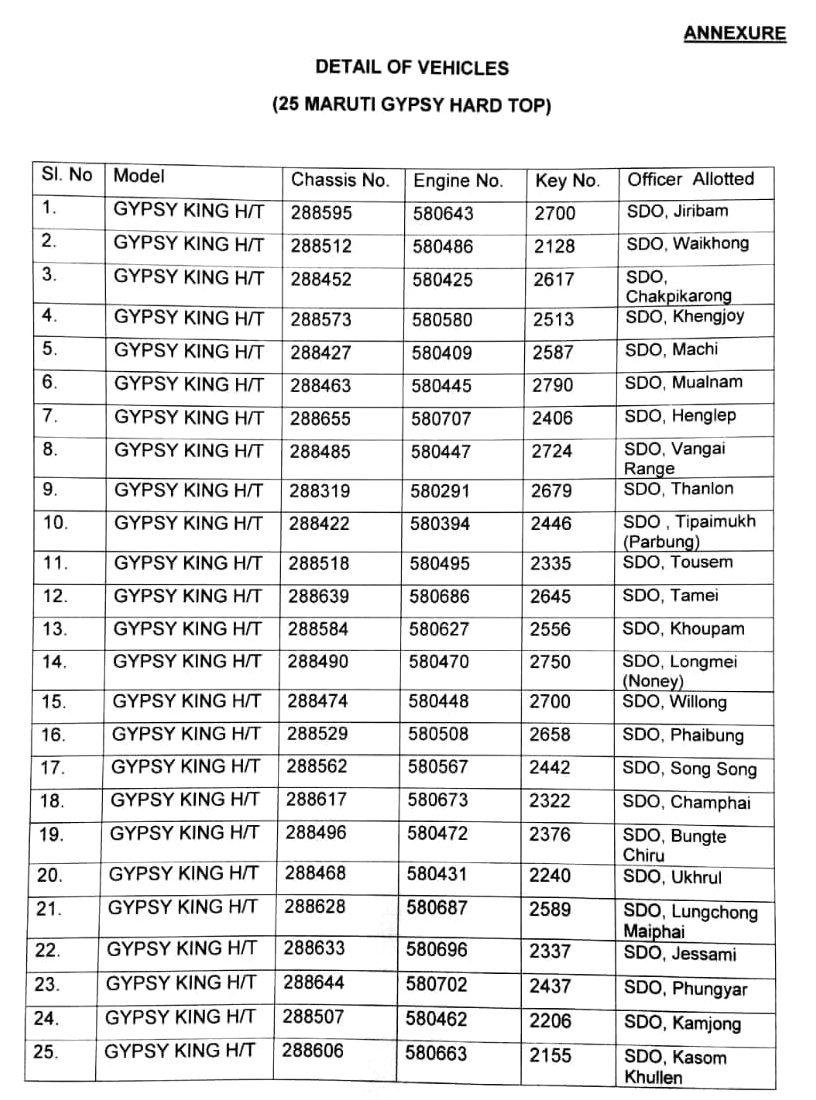 The government has purchased brand new Gypsy King vehicles for sub-divisional officers posted across the state. The Chief Secretary has issued an order to SDOs and SPs to collect the vehicles at Imphal on September 23, 2018, after an official ceremony.