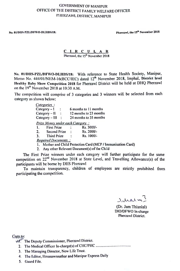 Healthy Baby Competition will be held at Pherzawl, the District HQ of Pherzawl District, on November 19, 2018, at 10.30 am onwards.