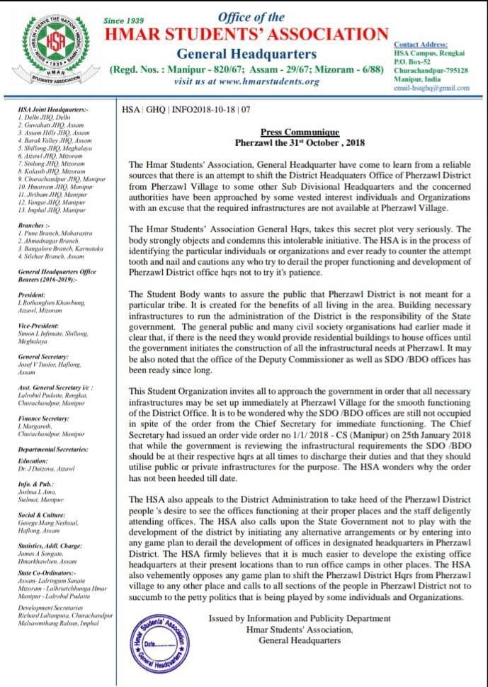 The Hmar Students Association has claimed that there is a “secret plot” to shift the headquarters of Pherzawl District to some other Sub Divisional Headquarters. The student body said in a press statement that it took the issue “seriously” while condemning the divisive approach taken some “vested interest individuals and organizations”.