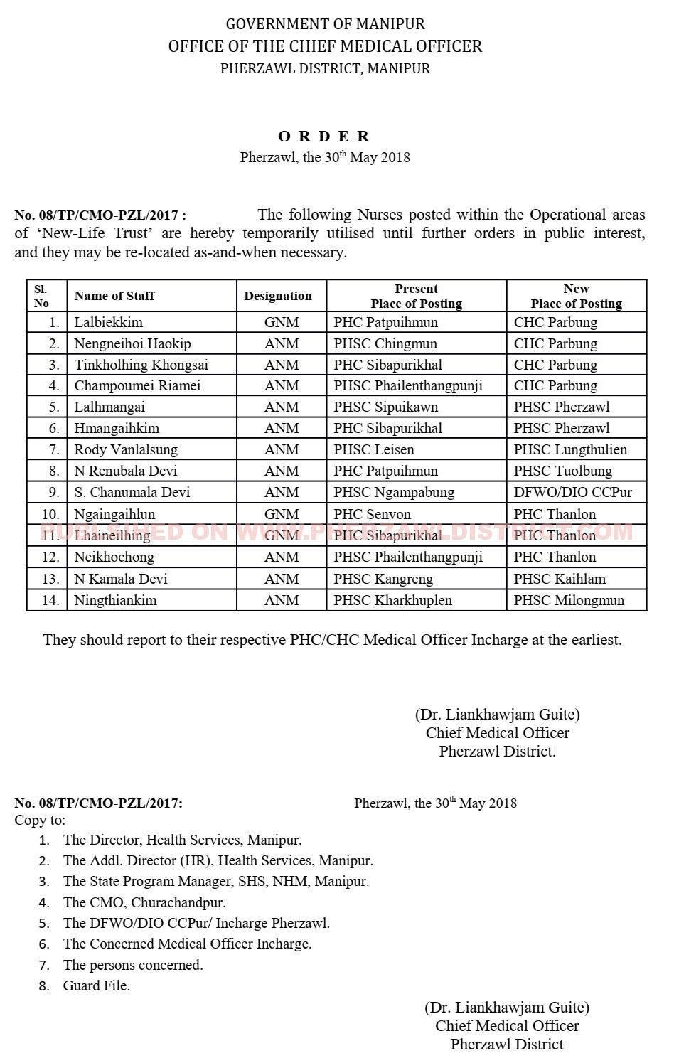 According to the CMO order, the following nurses posted within the Operational areas of ‘New-Life Trust’ are hereby temporarily utilized until further orders in public interest, and they may be re-located as-and-when necessary.