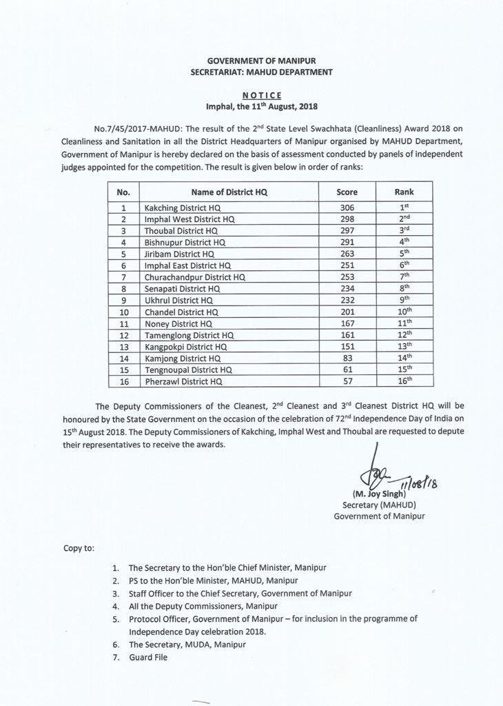 Coming at 16th position, the district headquarters could get just 57 points as against the winning district HQ of Kakching which got 306 points. It’s not clear what we’re the criteria for judging how clean the district headquarters are. However, one official source told CIDE that proper toilets were one among several conditions to be considered for the top spot in Cleanliness Award. Given below is the ranking of district headquarters.
