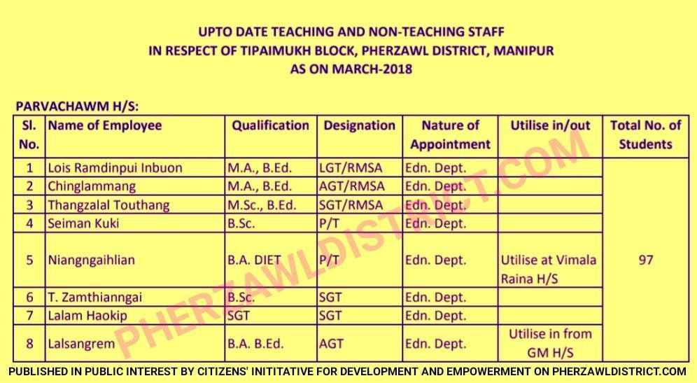 As per the latest government data available with Citizens’ Inititative for Development and Empowerment (CIDE), there are eight staff working at Parvachawm Government High School. Official data shows 97 students are studying in the school during the same academic year.